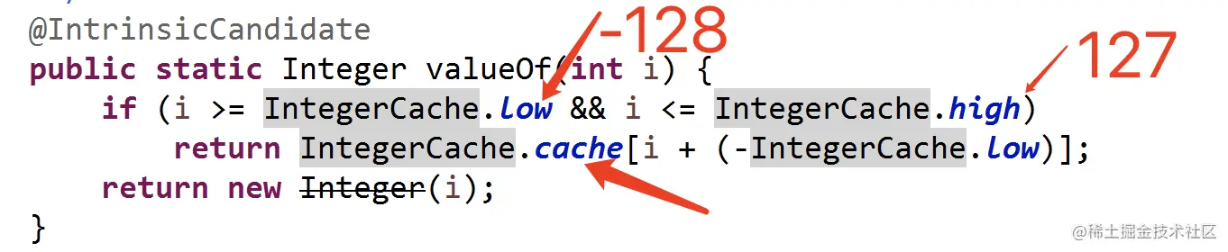 这段代码中,两个非new生成的Integer对象进行比较时,如果两个变量的取值在 -128到127 之间,则比较结果为true;如果两个变量的值不在此区间,则比较结果为false。 这又是为什么呢? 其实要想弄明白这个原因,我们只需要看看Integer类的valueOf()方法是怎么写的就可以了。valueOf()方法源码如下: