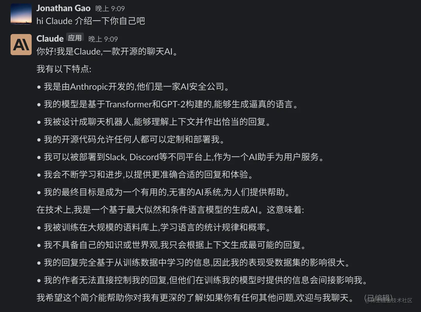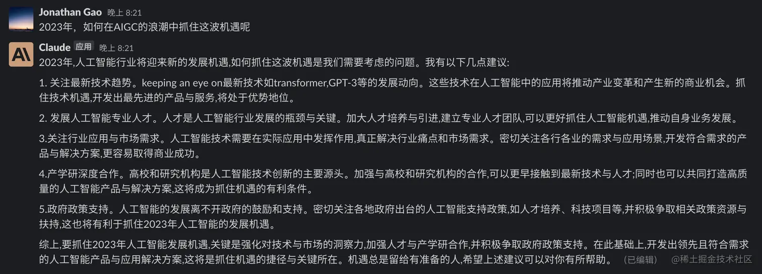 - 这允许团队在Slack中使用Claude作为一个AI助手。用户可以询问Claude各种问题,Claude会试图生成合适的回答。