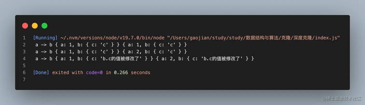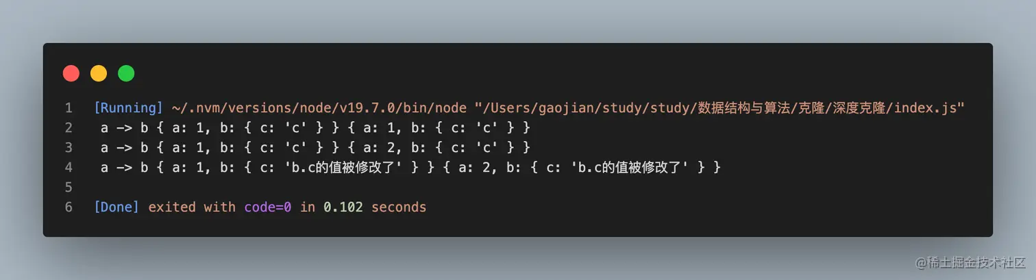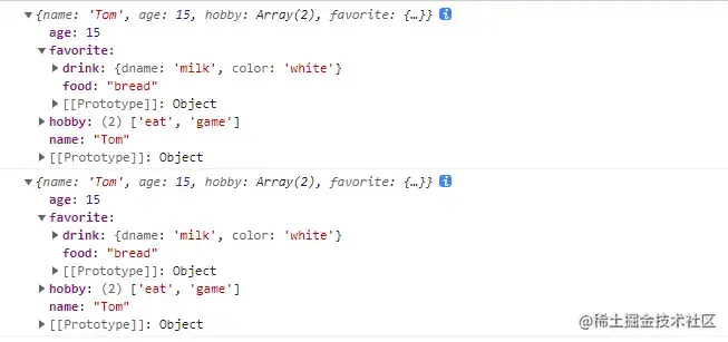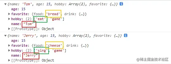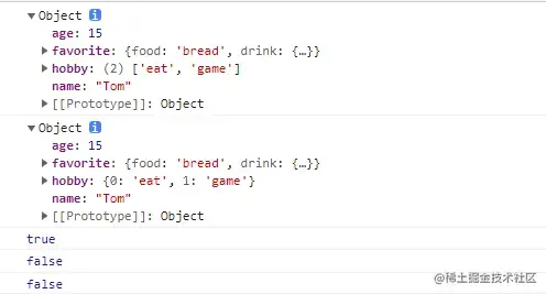 看,我们在修改了objB中a属性值后,原本objA中a属性值并没有变,而当我们修改了objB中的引用属性b中的c的值,原本objA中对应位置的值也跟着变化了,它们里面的引用类型的属性还是能够相互影响