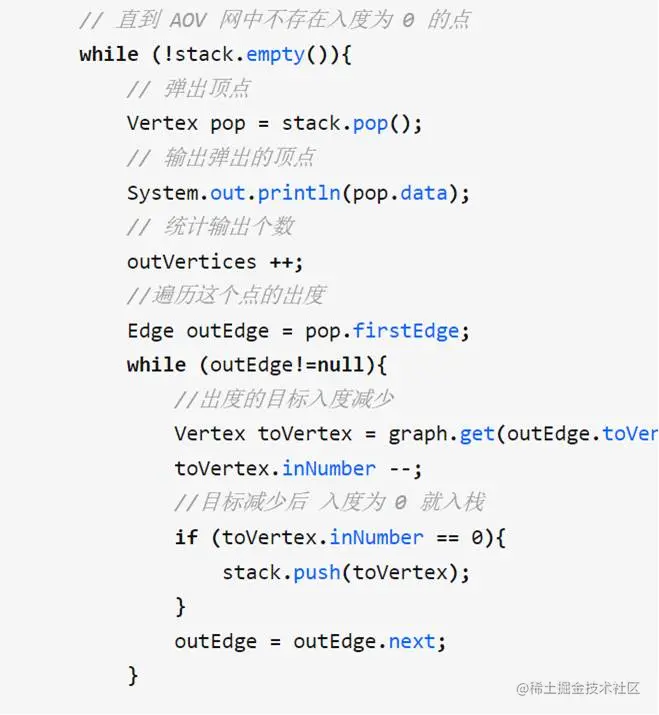 每次拿出一个顶点,要对该顶点的所有出边进行处理,如果处理过程中有新的入读为0的顶点要进行压栈