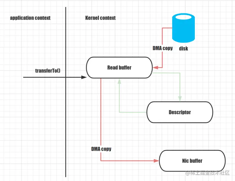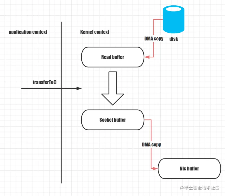 transferTo()方法使 DMA 引擎将文件内容复制到读取缓冲区中。然后内核将数据复制到与输出套接字关联的内核缓冲区中。