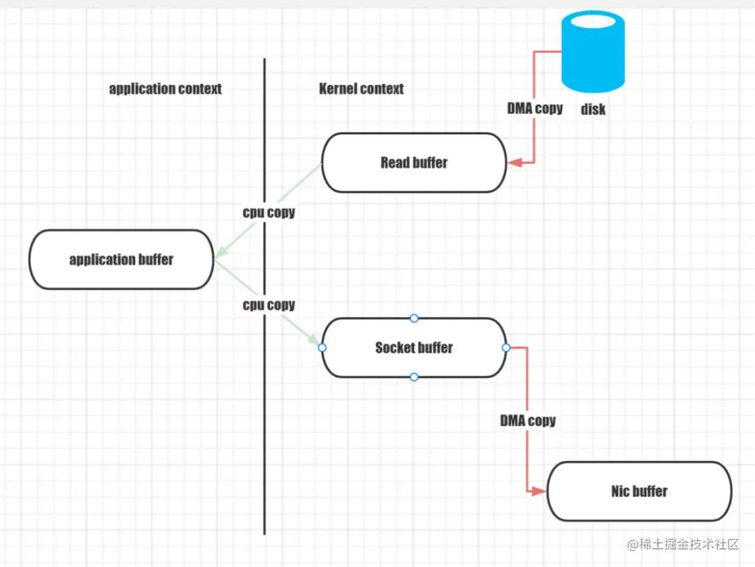 Read()调用导致从用户模式到内核模式的上下文切换,并在内部发出一个 sys_read()(或者其他等效的调用)以从文件中读取数据,第一个副本由 DMA 引擎执行,该引擎从磁盘读取文件内容并将它们存储到内核地址空间缓冲区中;