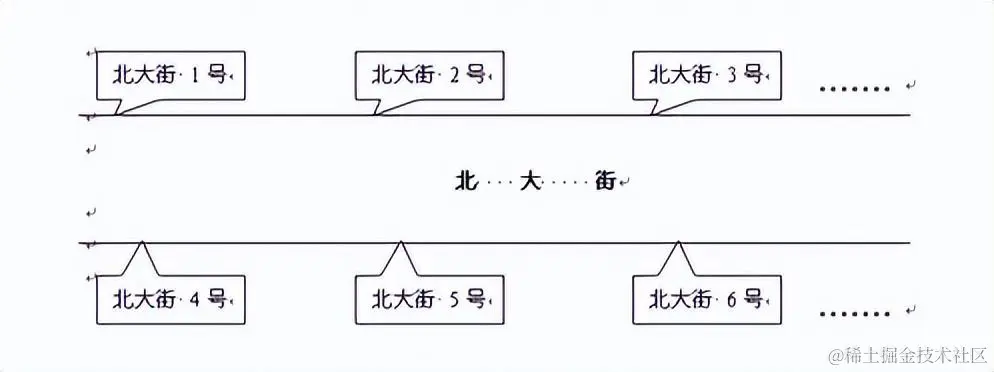 如下图所示,住在北大街的住户要能互相找到对方,必须各自都要有个门牌号,这个门牌号就是各家的地址,门牌号的表示方法为:北大街+XX号。假如1号住户要找6号住户,过程是这样的:1号在大街上喊了一声:"谁是6号,请回答.",这时北大街的住户都听到了,但只有6号作了回答,这个喊的过程叫"广播",北大街的所有用户就是他的广播范围。