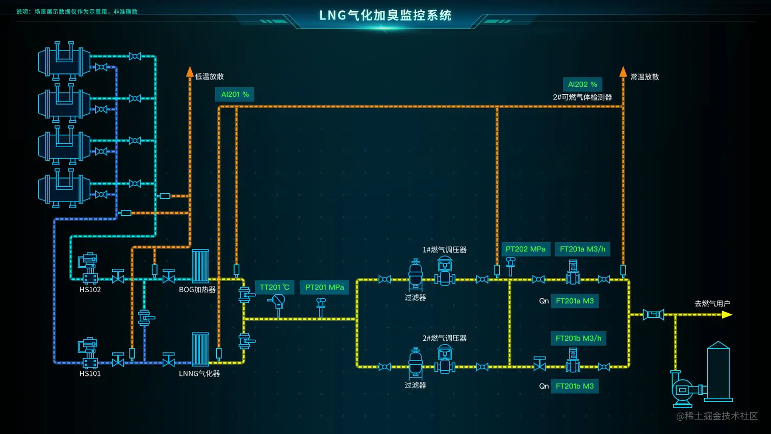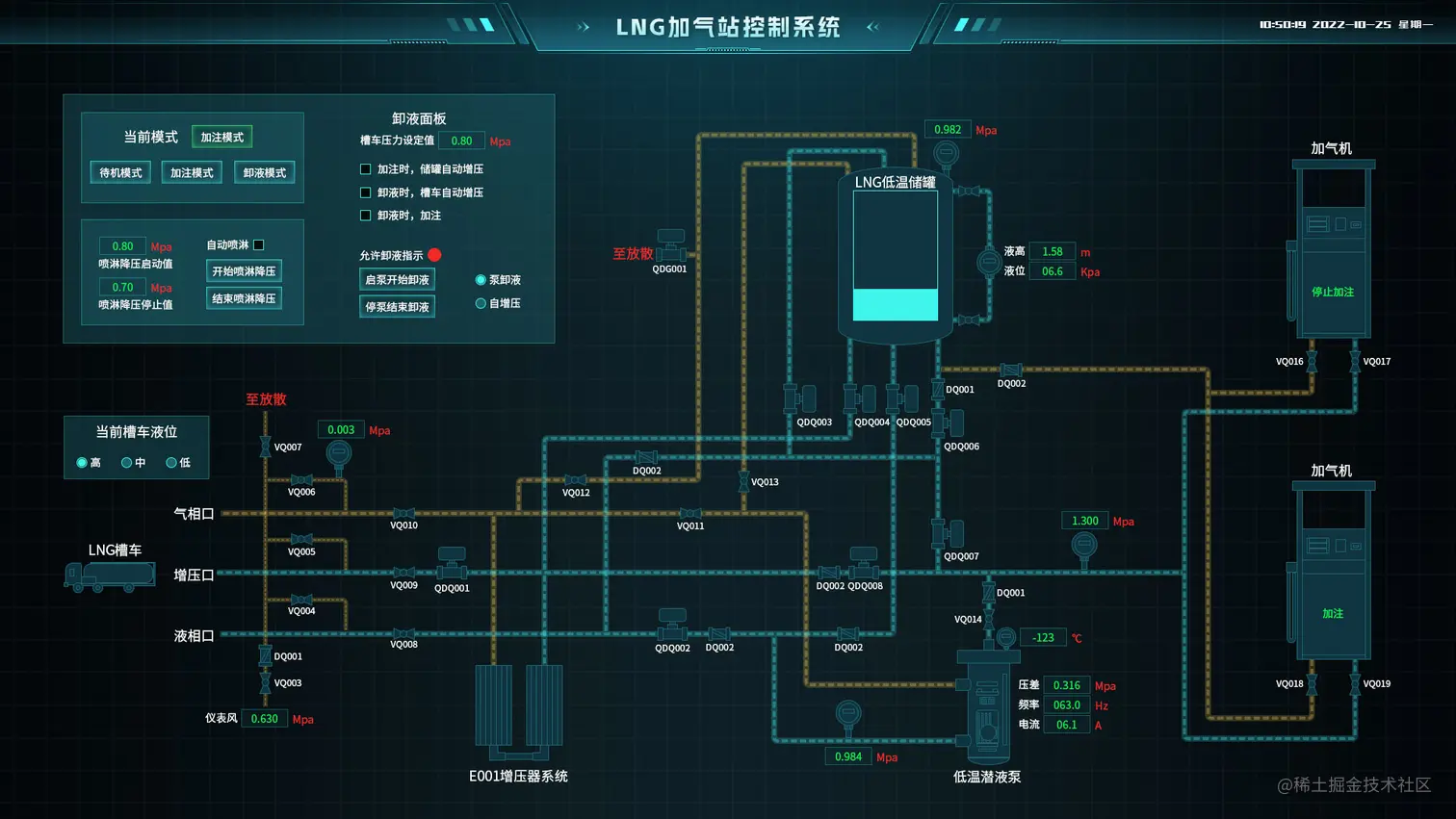 通过数维图软件 Sovit2D 工业组态打造智慧LNG加气站监控系统,实现加气站气罐、充装泵、灌装泵、压缩机等各单元的数据采集和控制管理,以图形化方式呈现出LNG加气站工艺流程的相关动态信息。