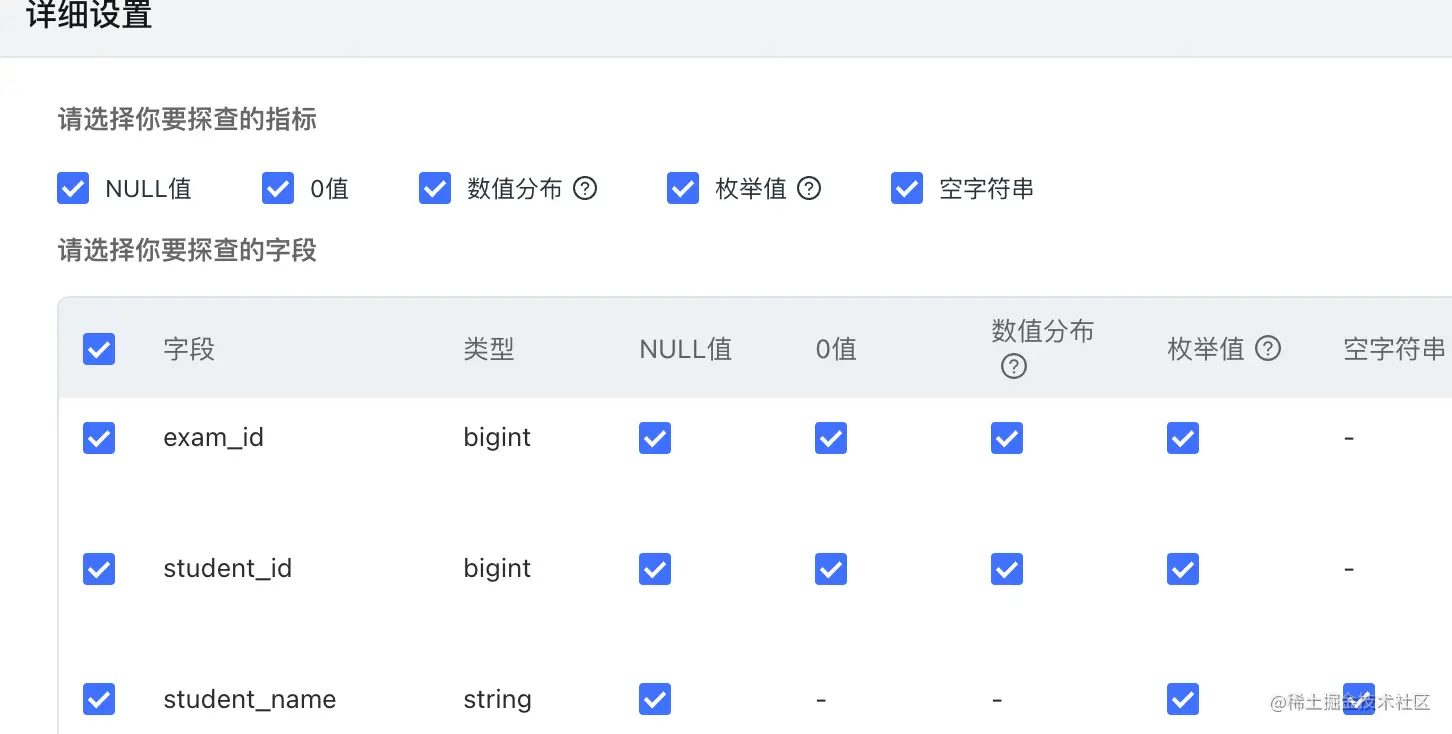 如下图所示,在随后的详细设置页面中,使用者对表NULL值、0值、数值分布、字段枚举值、字段空值等需要校验的项目进行勾选。