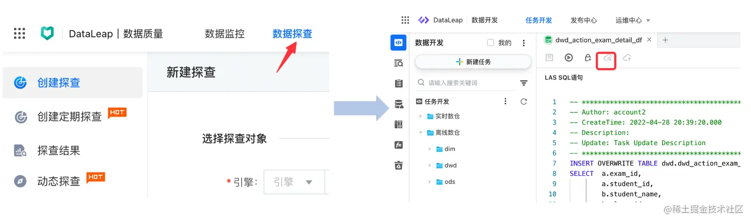 具体来说,用户从DataLeap进入「数据质量」即可找到「数据探查」模块,从这一界面中点击「确定」按钮即可创建校验。除此之外,用户在DataLeap中创建EMR/LAS SQL相关类型任务之后,也可以通过任务面板上的「数据校验」button进入「数据探查」模块。