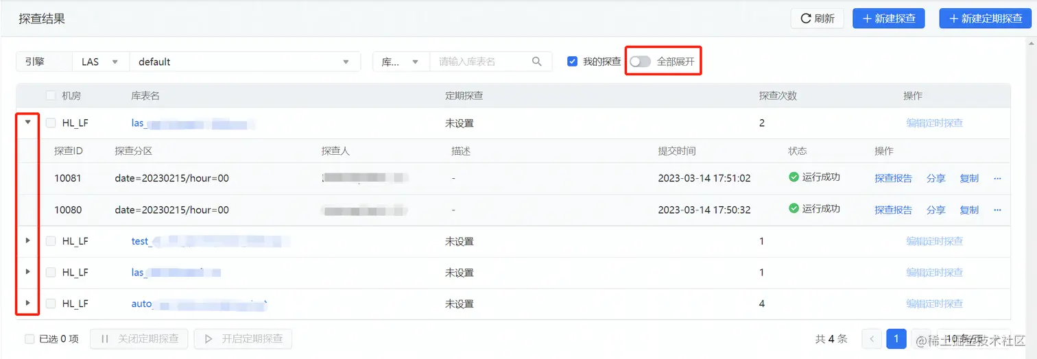 数据探查创建成功后,可以执行查看探查报告、搜索探查结果、查看运行日志等操作,点击探查结果列表前的折叠图标或点击全部展开按钮,展开列表信息