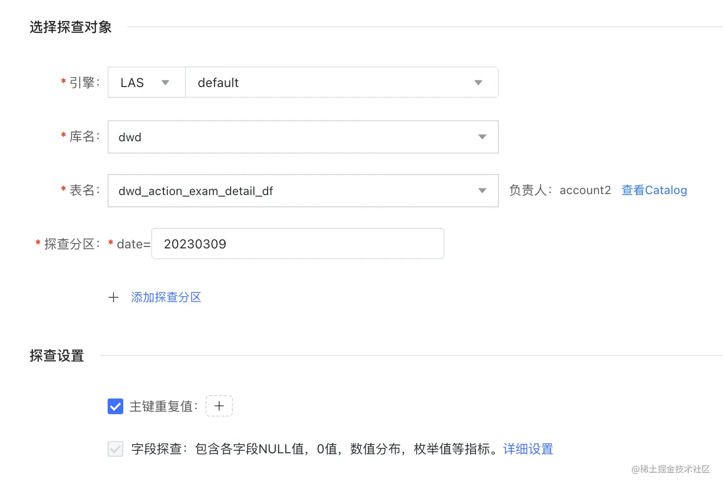 根据引擎侧选择探查对象,用户可在页面中选择表和库,并设置分区,和对应的探查设置,随后提交确认。