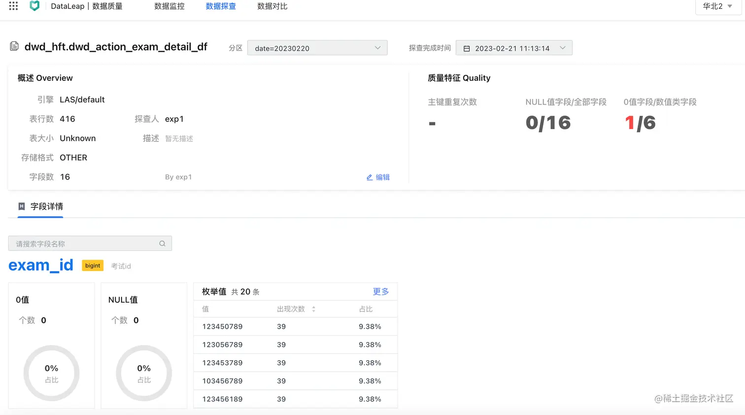 在校验概览中,用户可以看到整张表的探查规则下行数的枚举值分布,主键重复的行数,出现空值的字段数。