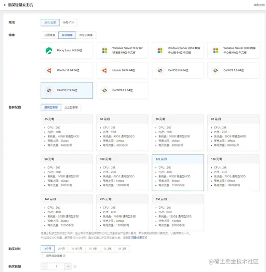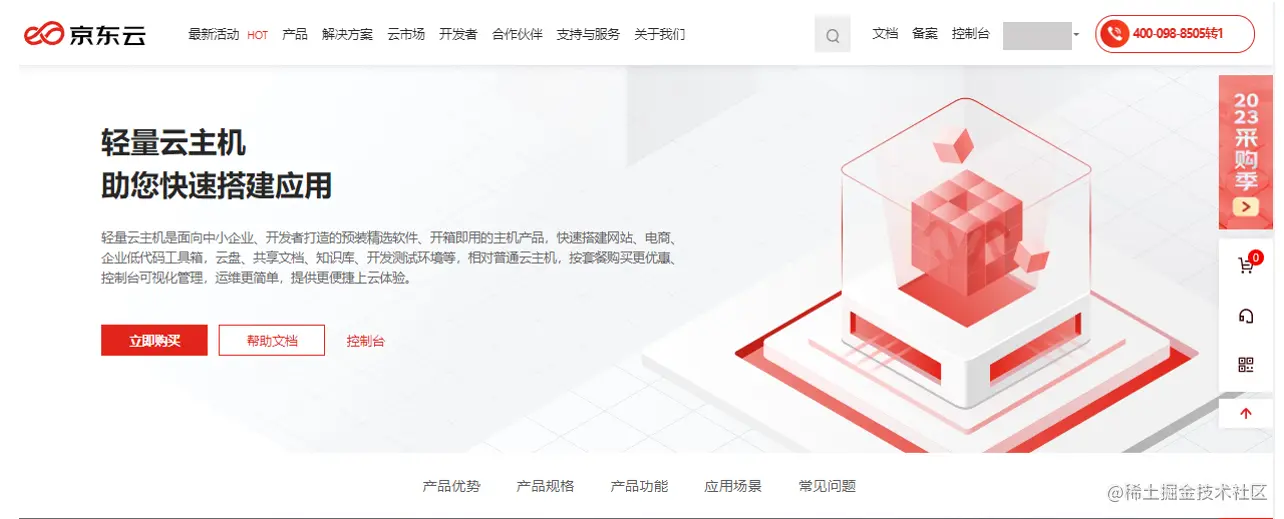 在京东云官网进入轻量云主机选购页,根据需求选择配置,本次使用的配置为2C4G5M800G月流量。现在这个机型正在促销很划算。