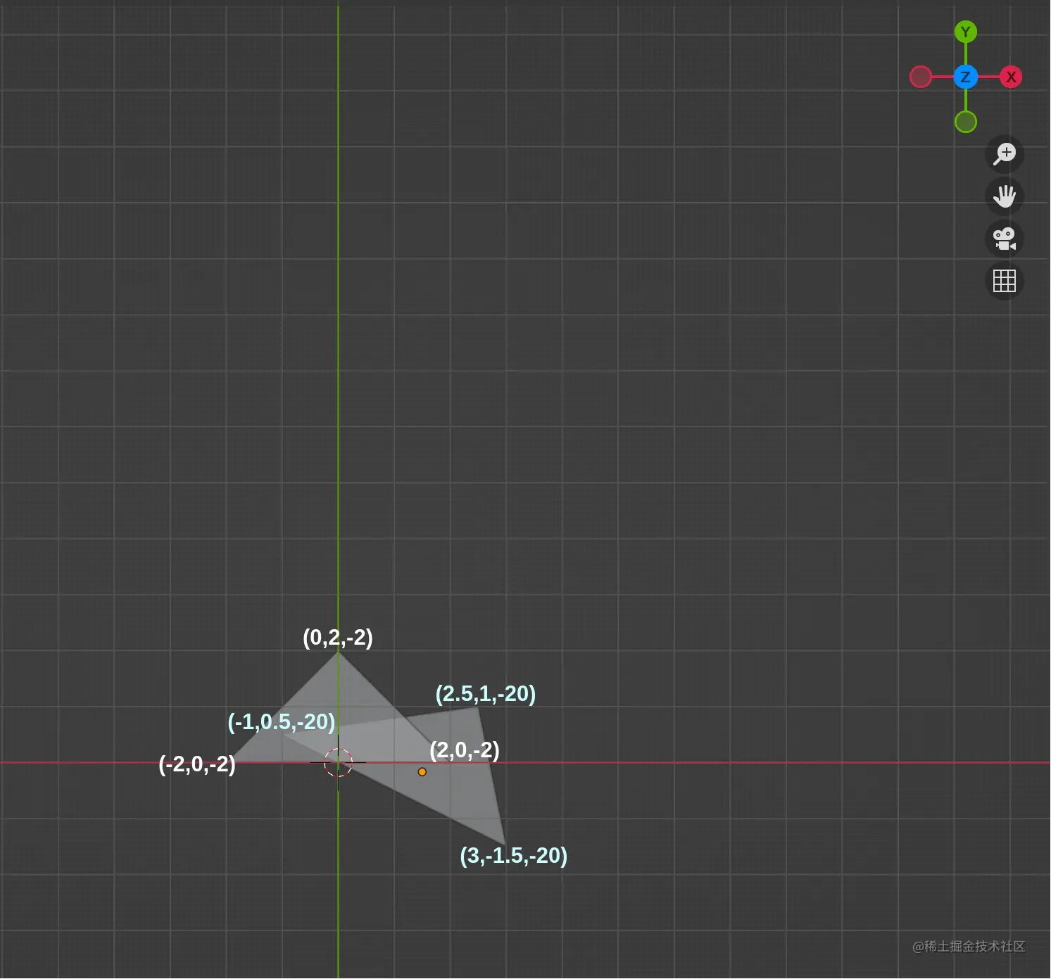 下文开始举例说明光栅化过程,为了更简单的说明光栅化,我们选用相对简单的模型,在三维空间中存在两个三角形,其中三角形1 三个顶点坐标分别为(-2, 0, -2)、(2, 0, -2)、(0, 2, -2),三角形2 三个顶点坐标分别为(-1, 0.5, -20)、(2.5, 1, -20)、(3, -1.5, -20),之所以后面三角形 z 绝对值比较大,是为了后面观察透视投影近大远小的效果。在模型中,除了被观察物体,还需要确认观察点的位置,这里将相机放在位置(0, 0, 0),观察方向是 z 轴负方向(z-),向上向量为 y 轴正向(y+)。模型如图1所示: