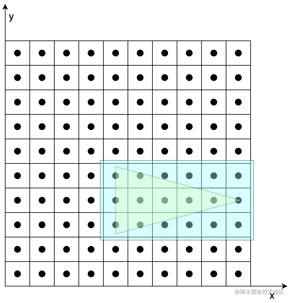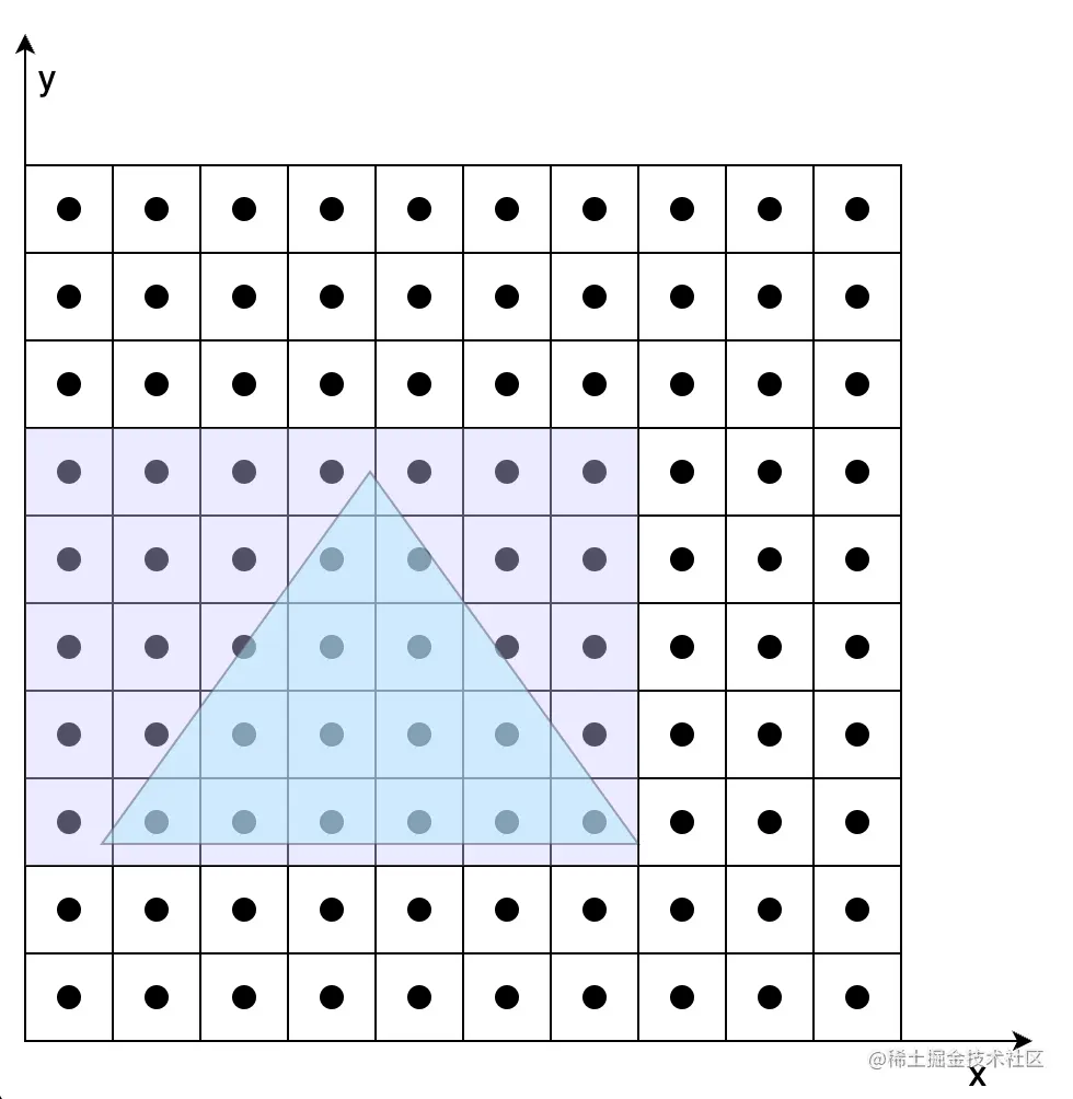 - 首先根据投影后三个顶点的范围确定一个包围盒,这么做的好处是减少搜索范围