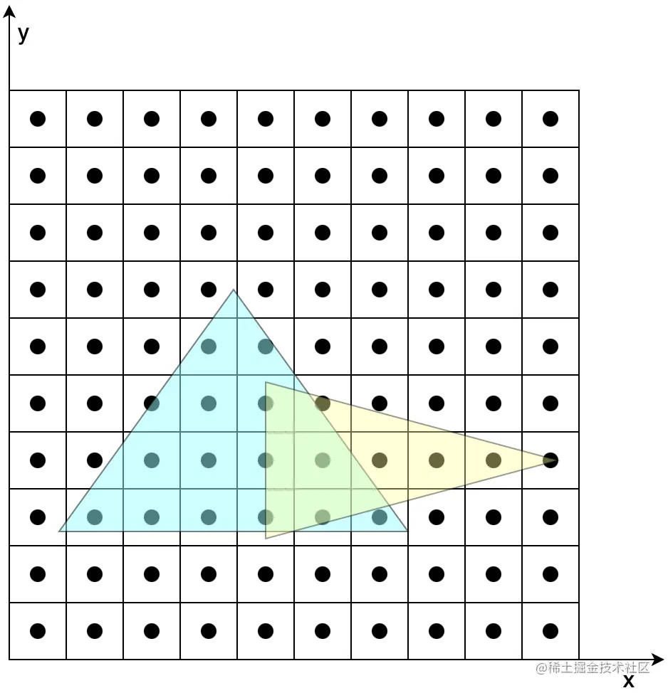 - 在判定像素与三角形位置关系时,我们判定的是小方格中心点与三角形关系,即使中心点不在三角形内,像素的小方格子仍然会被三角形覆盖,那么小格子是标记为不亮、还是按照被覆盖的面积来着色,这块如果处理的不好很容易出现锯齿,这里就需要反走样技术,这里不再阐述