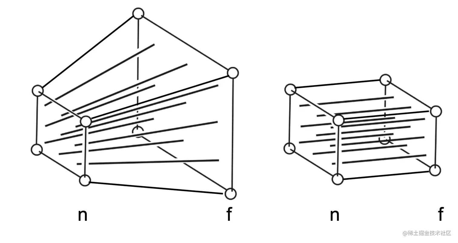 对比正交投影和透视投影效果可以发现,透视投影的结果会有近大远小的效果,而正交投影不会。正交投影中,以平行线投射方式投影,在工程制图等场景应用广泛。透视投影这种近大远小的效果和人眼成像效果基本一致,后面主要针对透视投影讲解。也正是因为这种效果,才有了"道理我都懂,可是为什么鸽子这么大"这个梗。绿色的球在视野之外,会被裁剪掉。透视投影本质就是对一个平截头体及平截头体里的物体(图2左半边虚线内部分,包含红球和黄球)做变换,这时候平截头体会被压成长方体(图3-1),变换后的物体也包含在这个长方体中,最终长方体标准化生成[-1, 1] ^ 3标准正方体(图3-2),然后再针对[x, y]平面做投影,投影过程中z轴作为深度覆盖参考。