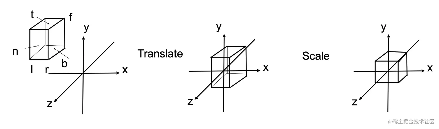 - 这里没有推导透视投影矩阵,而是直接给出了矩阵变换后的效果图,一是希望读者从直观上感受透视投影的效果,二是文章主要内容是光栅化过程的概述,推导不作为重点。如果想了解透视投影的原理,可以学习《GAMES101》或者从《Fundamentals of Computer Graphics》中寻找答案