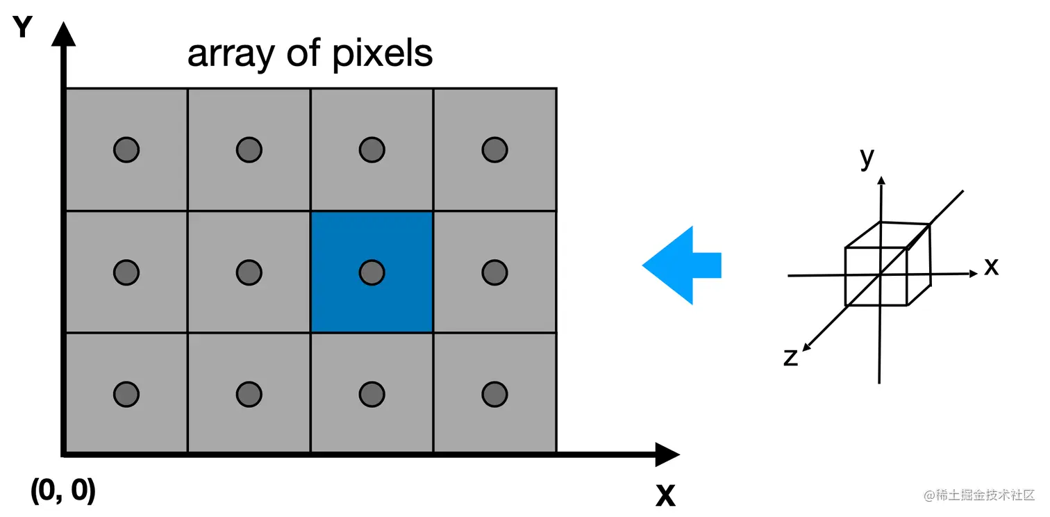 - Rasterization: 光栅化操作,对于我们这个例子就是对两个三角形做透视投影 --> 然后向[x, y]平面做投影 --> 视口变换,然后判定投影后的三角形内包含了多少像素