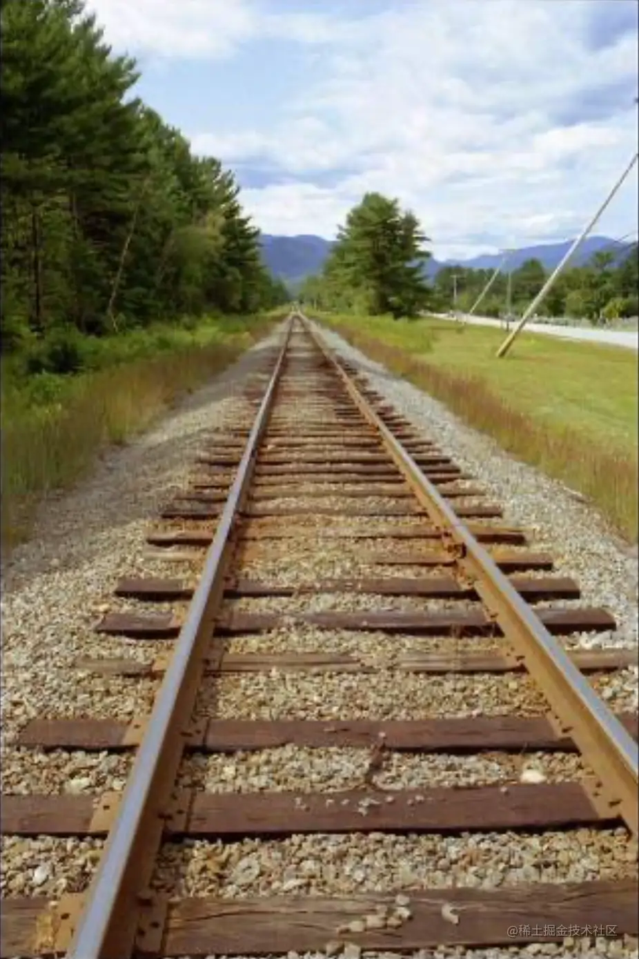 图4-1铁轨是平行的,但在透视投影的作用下,原本的平行线在远处变得相交。图4-2是观察正交视图和透视视图来对比两者区别,同样,在透视投影下,会有近大远小的效果,(图中四个顶点坐标分别为(-1, 10, -20), (1, 10, -20), (-1, -1, 0), (1, -1, 0),z 轴俯视观察。