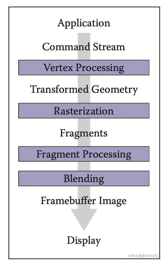 - Vertex Processing: 顶点处理,对空间中顶点进行变换,针对我们例子中简化的两个三角形模型,透视投影包含在顶点变换中