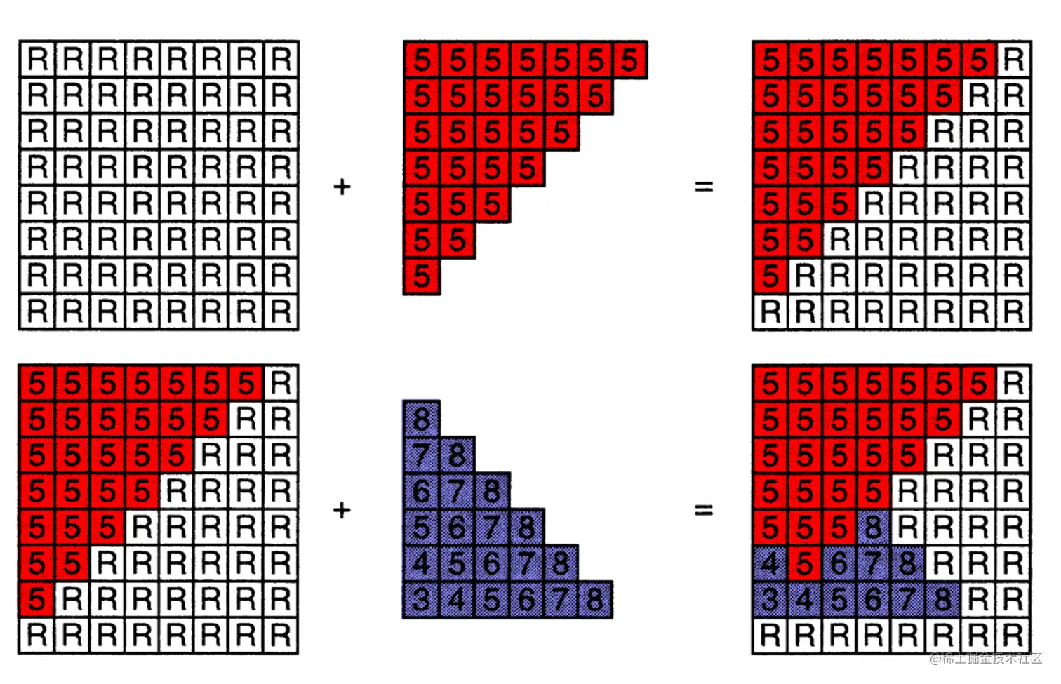 图7-1在不考虑覆盖的情况下,根据两个三角形各自顶点变换后的结果,确定两个三角形的位置。图7-2、7-3是在确定三角形位置后,根据三角形覆盖的像素对其着色。具体步骤如下(以图7-2为例):
