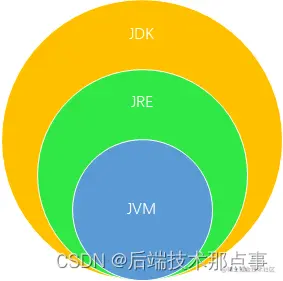 - JRE(Java Runtime Environment Java运行环境):包括Java虚拟机(JVM Java Virtual Machine)和Java程序所需的核心类库等,如果想要运行一个开发好的Java程序,计算机中只需要安装JRE即可。
