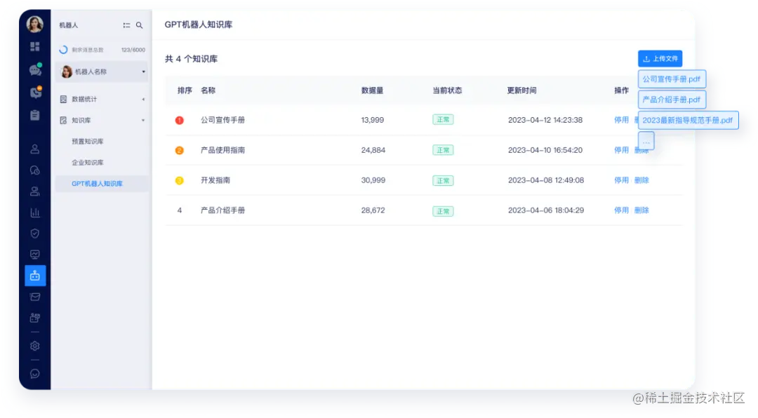 企业只需要将企业资料的文件上传到GPT机器人知识库中,AI 模型会自己“学习”相关知识,省掉了大量的人工成本与时间成本。
