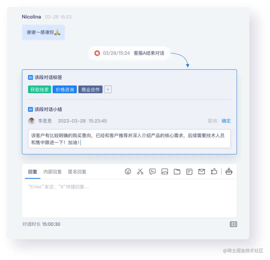 此外,过去需要手动整理的对话标签与对话小结,现在也可以由 AI 进行预处理,人工客服只需进行确认、修改即可。