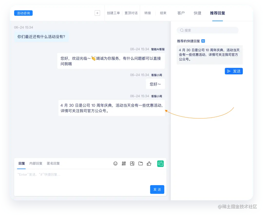 人工接待场景下,模型会根据客服与顾客对话的内容,以及企业业务知识,实时生成更加精准的机器人辅助回答,并在对话界面推荐给客服人员,省去了客服自行查找相关信息的时间。