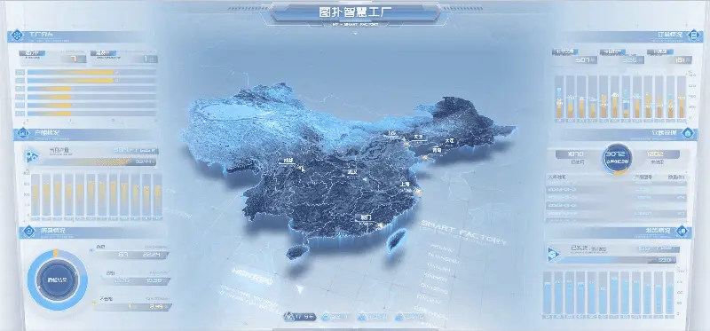 考虑到市场需求、原材料来源、人工成本、交通物流等多方面的影响,该场景采取网络式分布模式,将工厂分布在多个城市,结合三维地图,形成构建一幅完整的企业分布地图。可通过点击交互事件,直观了解各个工厂的生产情况。通过互联网技术和物流配送等形式,实现生产流程的大幅优化,达到降低成本、提高效率的目标。