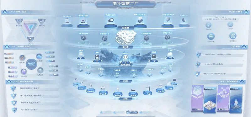 另外利用图扑软件 Web 3D 技术,将智能工厂的工业互联网平台架构和全生命周期的生态平台架构,以三维可视化的方式构建出来,与传统的二维平面图相比,可以更加直观、全面、效果更好、交互性更强,将不同对象之间的空间关系和相互作用表现得更好。