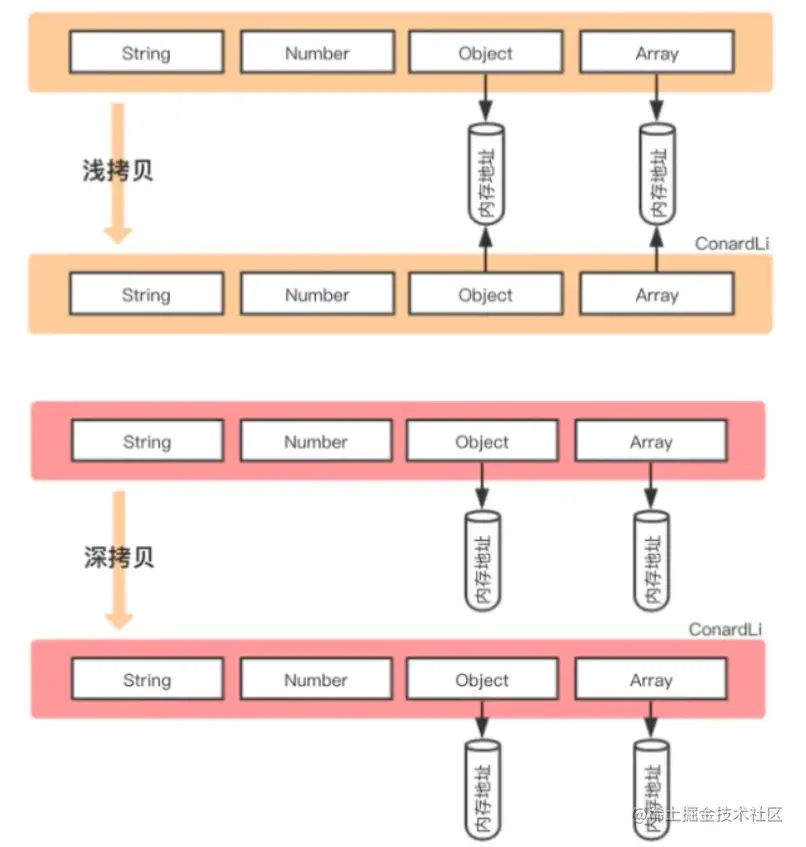 - 复杂数据类型:拷贝的是内存地址, 即浅拷贝是拷贝一层地址,深层次的引用类型则共享内存地址