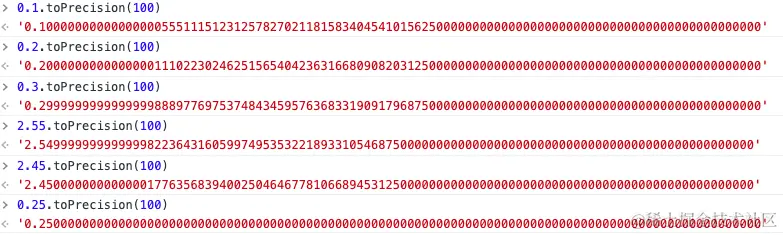 从上可知,toFixed时候其实是进行四舍五入,但是由于2.55在计算中存储为2.549999999...,2.45存储为2.4500000...,所以就导致了2.55.toFixed(1)➡️2.5、2.45.toFixed(1)➡️2.5