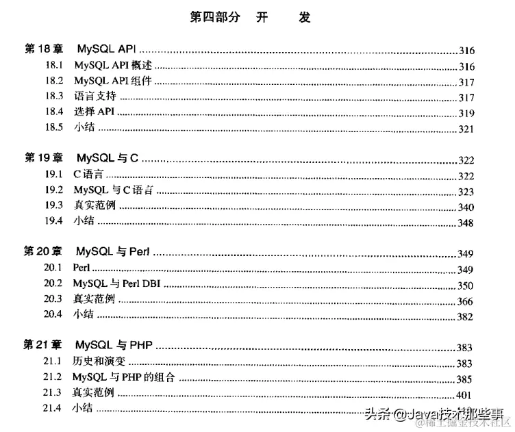 第18章 通过一系列API揭示了MySQL内部结构的情况和基本原理,对各种API的性能提供了简要的描述。其目的是帮助开发者选择适合他们的特殊要求的API。本章还对不同API之间相互比较的优点进行了论述。