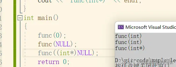 #include<iostream> using namespace std; void func(int) { cout << "func(int)" << endl; } void func(int*) { cout << "func(int*)" << endl; } int main() { func(0); func(NULL); func((int*)NULL); return 0; }运行结果: