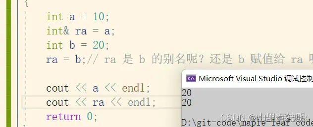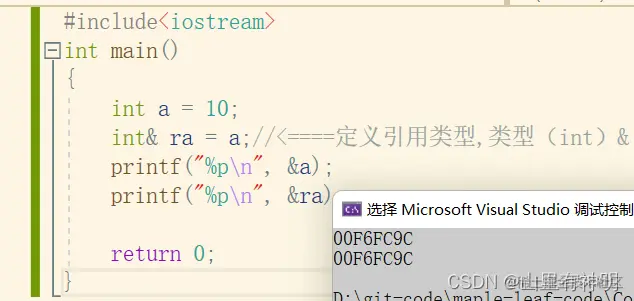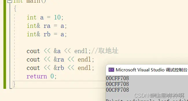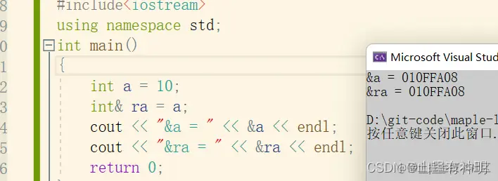 #include<iostream> using namespace std; int main() { int a = 10; int& ra = a; cout << "&a = " << &a << endl; cout << "&ra = " << &ra << endl; return 0; }运行结果: