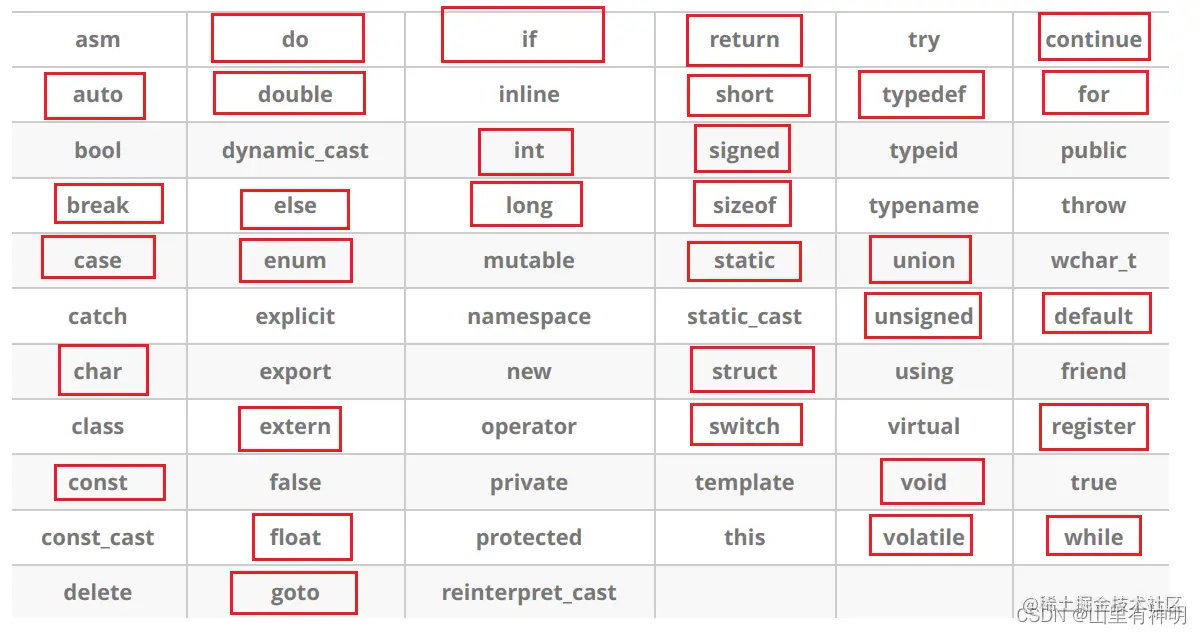 打红色方框的是 C语言的关键字,剩下的是 C++ 对 C语言关键字的补充。