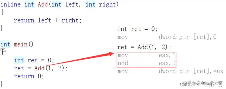 如果在上述函数前增加i nline 关键字将其改成内联函数,在编译期间编译器会用函数体替换函数的调用,ps:
