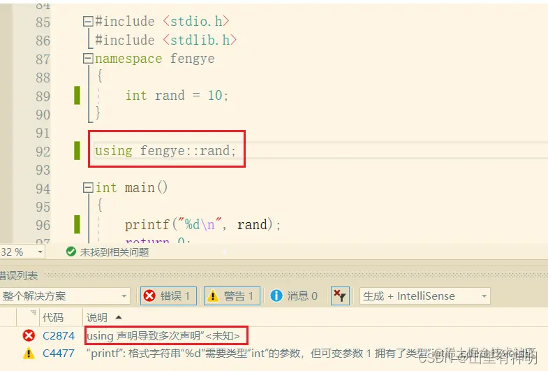 //namespace 后加命名空间的名字,例如我将它命名为 fengye namespace fengye { //注意:一个命名空间就定义了一个新的作用域,命名空间中的所有内容都局限于该命名空间中 //命名空间中可以定义变量/函数/类型 int rand = 10; int Add(int a, int b) { return a + b; } struct Node { struct Node* next; int val; };(2)命名空间可以嵌套