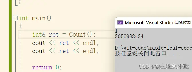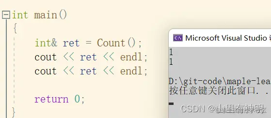 #include<iostream> using namespace std; int& Count() { int n = 0; n++; return n;//n 随着函数调用结束就被销毁了 } int main() { int& ret = Count(); cout << ret << endl; cout << ret << endl; return 0; }运行结果: