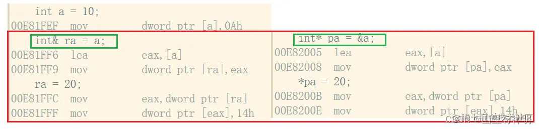 #include<iostream> using namespace std; int main() { //从语法角度,ra没有开辟空间 int a = 10; int& ra = a; ra = 20; //从语法角度,pa 开了4 or 8 byte int* pa = &a; *pa = 20; return 0; }在调试的反汇编下: