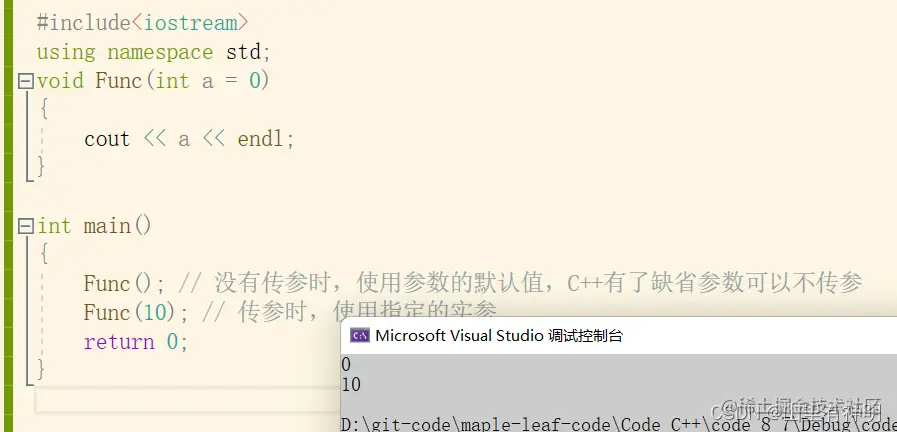 #include<iostream> using namespace std; void Func(int a = 0) { cout << a << endl; } int main() { Func(); // 没有传参时,使用参数的默认值,C++有了缺省参数可以不传参 Func(10); // 传参时,使用指定的实参 return 0; }运行结果: