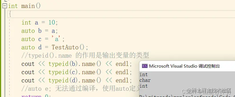 #include<iostream> using namespace std; int main() { auto a = 1, b = 2; auto c = 3, d = 4.0; // 该行代码会编译失败,因为c和d的初始化表达式类型不同 return 0; }运行结果: