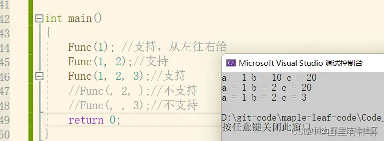 #include<iostream> using namespace std; void Func(int a, int b = 10, int c = 20) { cout << "a = " << a << ' '; cout << "b = " << b << ' '; cout << "c = " << c << endl; } int main() { Func(1); //支持,从左往右给 Func(1, 2);//支持 Func(1, 2, 3);//支持 //Func(, 2, );//不支持 //Func(, , 3);//不支持 return 0; }运行结果: