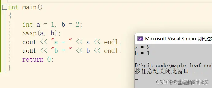 #include<iostream> using namespace std; void Swap(int& a1, int& a2) { int temp = a1; a1 = a2; a2 = temp; } int main() { int a = 1, b = 2; Swap(a, b); cout << "a = " << a << endl; cout << "b = " << b << endl; return 0; }运行结果: