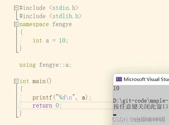 #include <stdio.h> #include <stdlib.h> namespace fengye { int a = 10; } using fengye::rand; int main() { printf("%d\n", a); return 0; }运行结果: