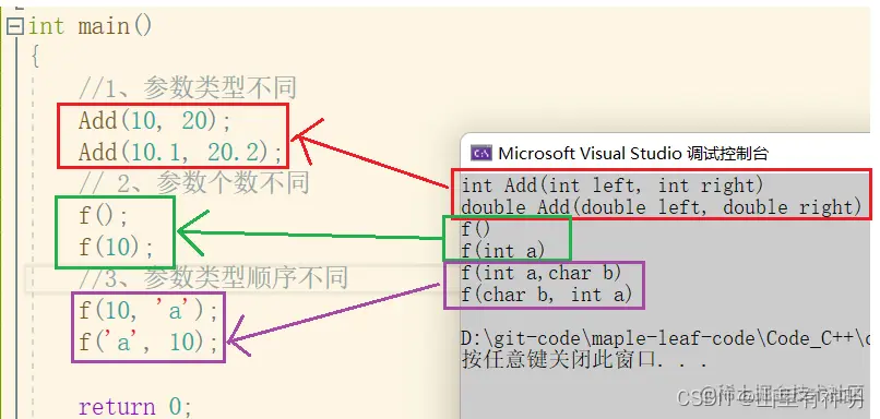 #include<iostream> using namespace std; // 1、参数类型不同 int Add(int left, int right) { cout << "int Add(int left, int right)" << endl; return left + right; } double Add(double left, double right) { cout << "double Add(double left, double right)" << endl; return left + right; } // 2、参数个数不同 void f() { cout << "f()" << endl; } void f(int a) { cout << "f(int a)" << endl; } // 3、参数类型顺序不同 void f(int a, char b) { cout << "f(int a,char b)" << endl; } void f(char b, int a) { cout << "f(char b, int a)" << endl; } int main() { //1、参数类型不同 Add(10, 20); Add(10.1, 20.2); // 2、参数个数不同 f(); f(10); //3、参数类型顺序不同 f(10, 'a'); f('a', 10); return 0; }运行结果:
