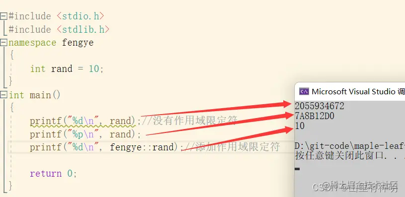 #include <stdio.h> #include <stdlib.h> namespace fengye { int rand = 10; } int main() { printf("%d\n", rand);//没有作用域限定符 printf("%p\n", rand); printf("%d\n", fengye::rand);//添加作用域限定符 return 0; }运行结果: