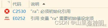 //权限不能放大 const int a = 10; //int& ra = a;//error const int& ra = a;//true //权限可以缩小 int c = 10; const int& rc = c;//true //权限相同 const int d = 10; const int& rd = d;权限可以缩小和不变,但是权限不能扩大。正常的变量的权限可以进行读写,用 const 修饰的变量变成了常变量,只有读的权限,写的权限被限制了,说明用 const 修饰的变量权限缩小了。ps:const int a = 10,被 const 修饰权限缩小了,然后进行 int& ra = a,这明显错了,权限不能放大; a 下面的道理相同,就不解释了。