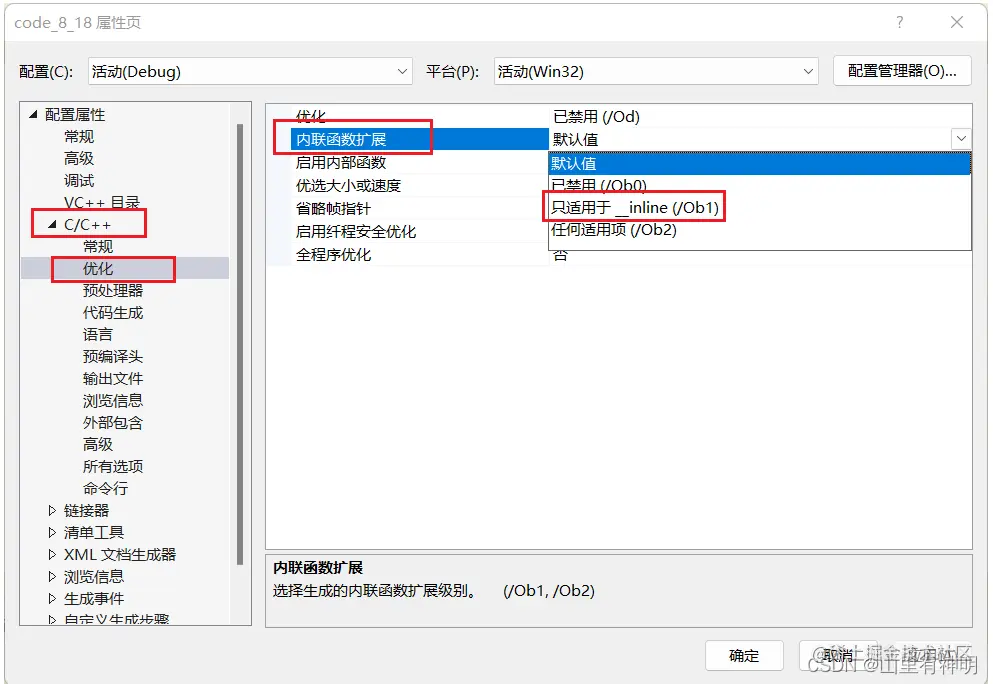 2. 在debug模式下,需要对编译器进行设置,否则不会展开(因为 debug 模式下,编译器默认不会对代码进行优化)vs2019 设置
