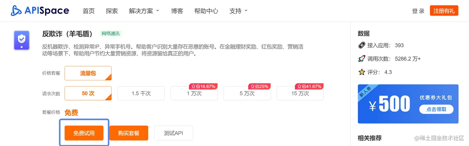 注册登录 APISpace 之后,在 反欺诈(羊毛盾)API 详情页 可以看到【免费试用】的按钮,点击即可获得相应的免费次数。