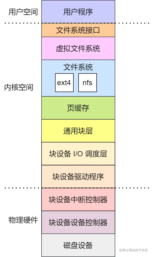 - 文件系统层:包括虚拟文件系统和其他文件系统的具体实现,它向上为应用程序统一提供了标准的文件访问接口,向下会通过通用块层来存储和管理磁盘数据。